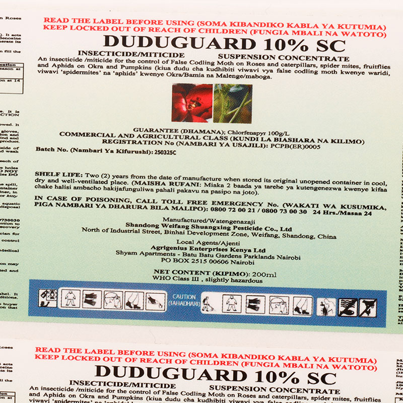 Pesticide labels deliver critical safety and usage information for agricultural and household chemical products. Designed with durable, chemical-resistant materials, they display handling instructions, hazard warnings, and compliance details to ensure safe application. Ideal for packaging in farming, gardening, and pest control industries, these labels meet strict regulatory standards while promoting user safety and environmental responsibility.