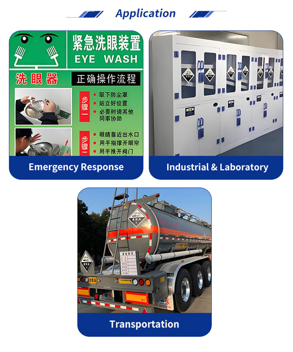 1.This hazardous chemical label is designed for application on production containers, storage vessels, transportation carriers, as well as containers or identification carriers used during handling or disposal of hazardous chemicals.