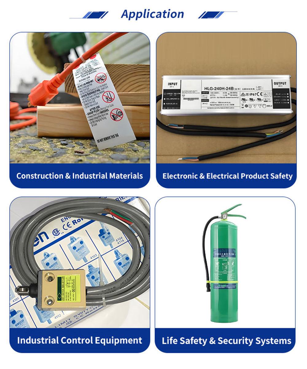 1.This UL-compliant label is designed for application on power adapters, household appliances, and other electronic devices, as well as on building materials such as wires and cables, lighting products, firefighting equipment, and fire doors requiring UL safety certification.