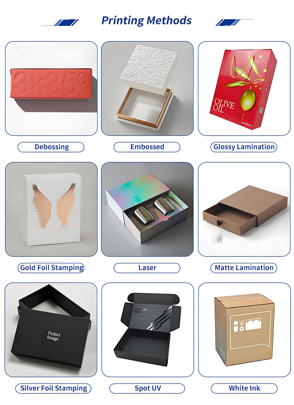 | Finishing | Glossy or matte lamination, varnish, UV coating, gold or silver stamping, spot UV, embossing, debossing,creasing etc. |