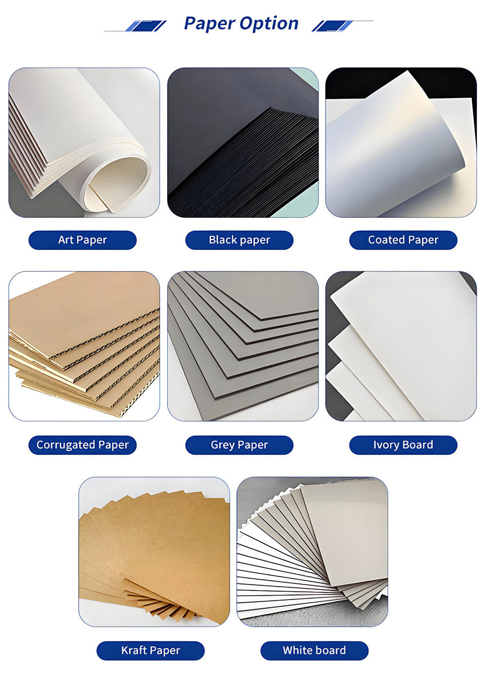 | Material | white cardboard, coated paper, art paper, duplex paper, fancy paper, recycled paper etc. |