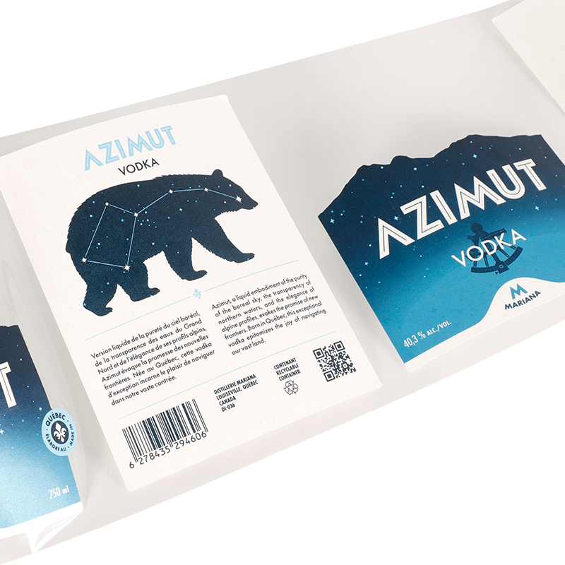 1.This roll of VODKA labels uses high-quality offset printing technology, combined with transparent base paper and special fine-glitter face stock, creating an exquisite sparkling visual effect that significantly enhances the product’s premium feel.
